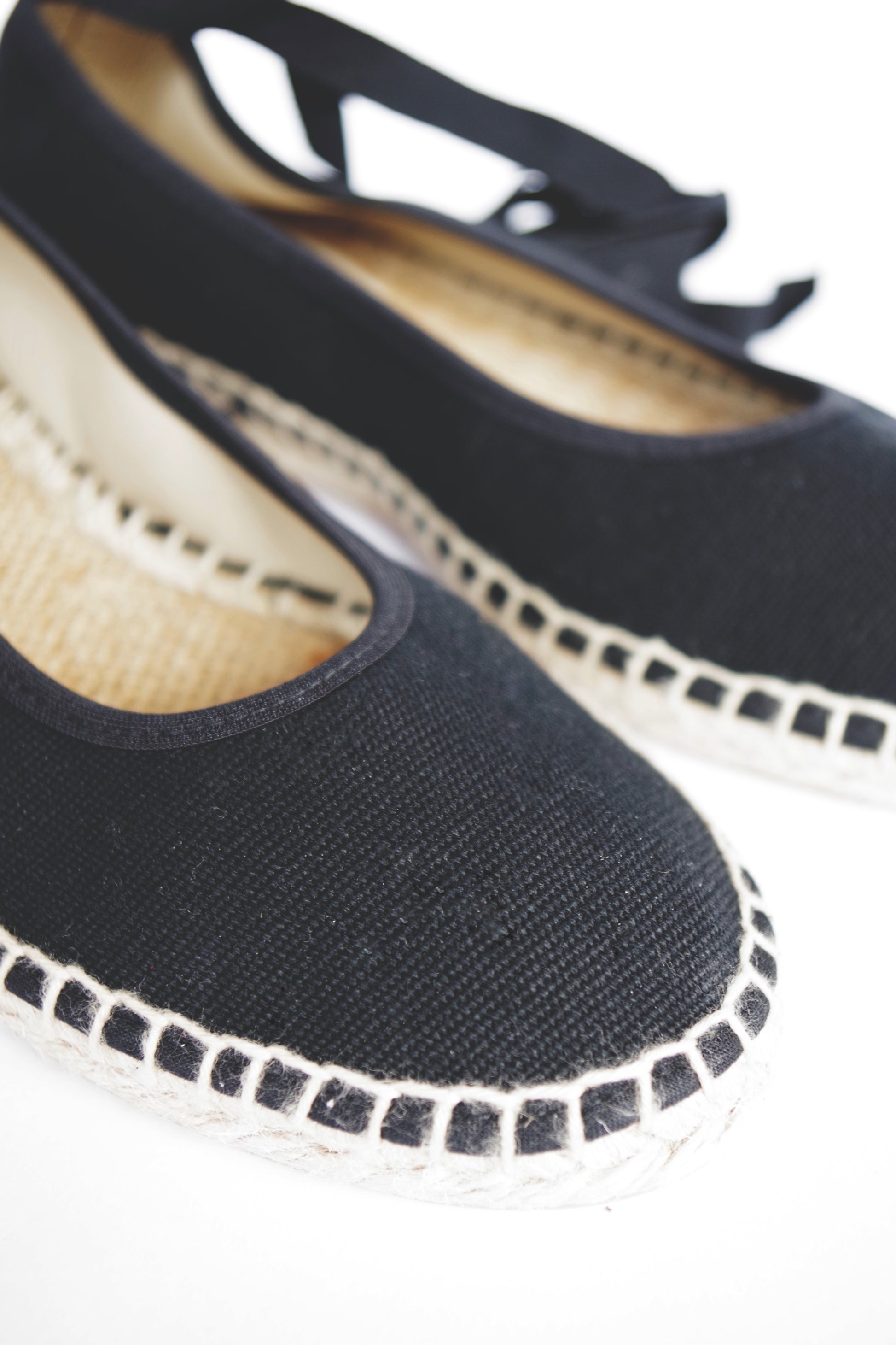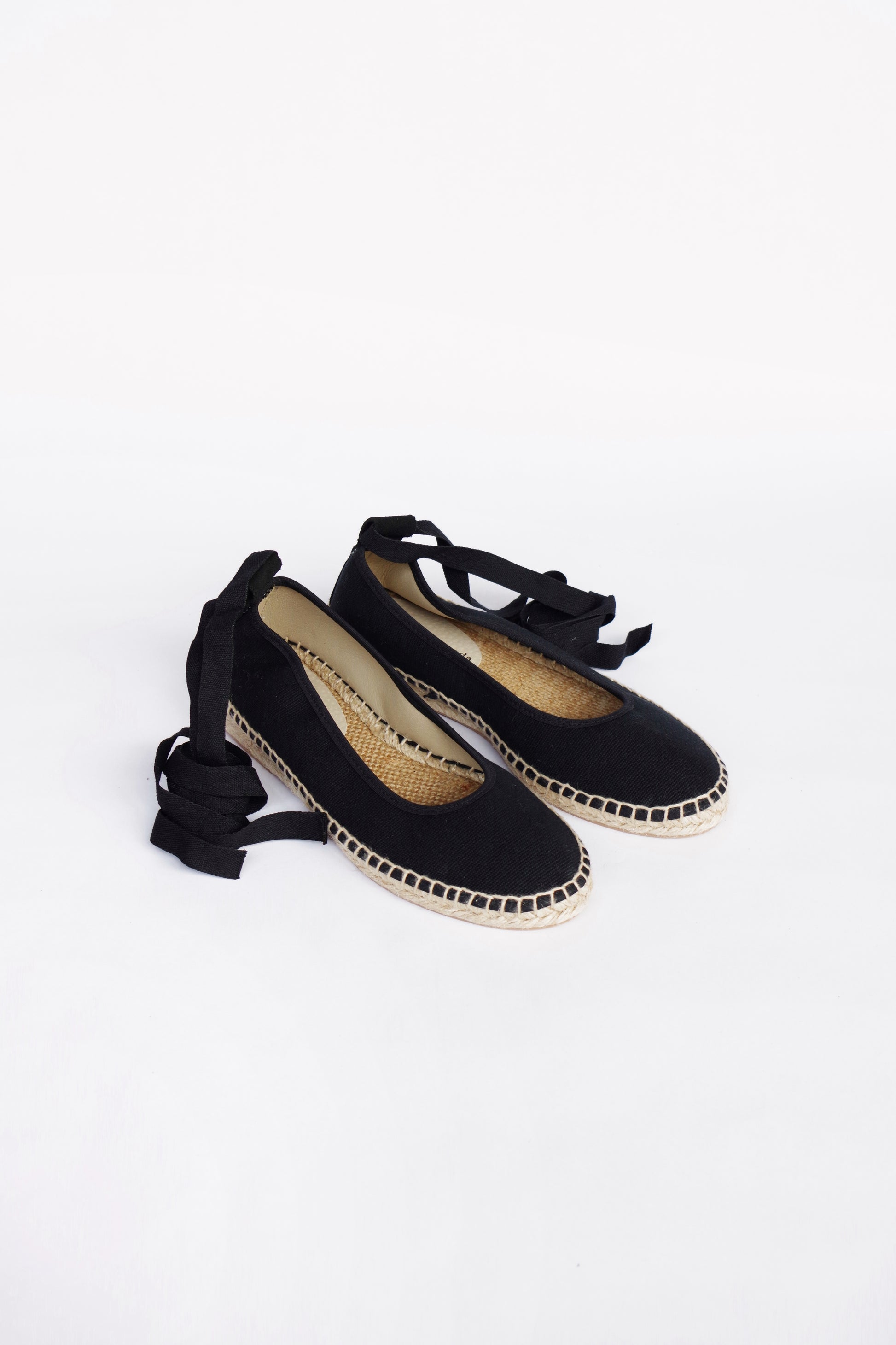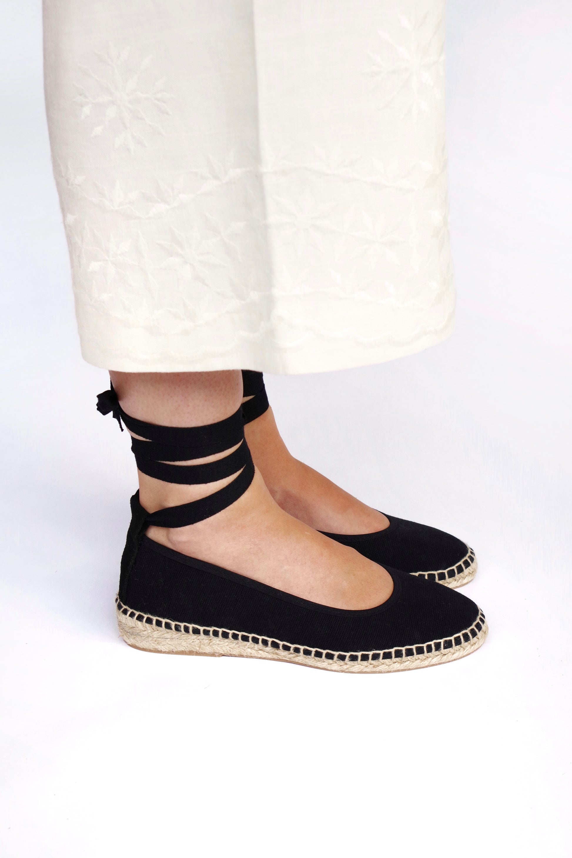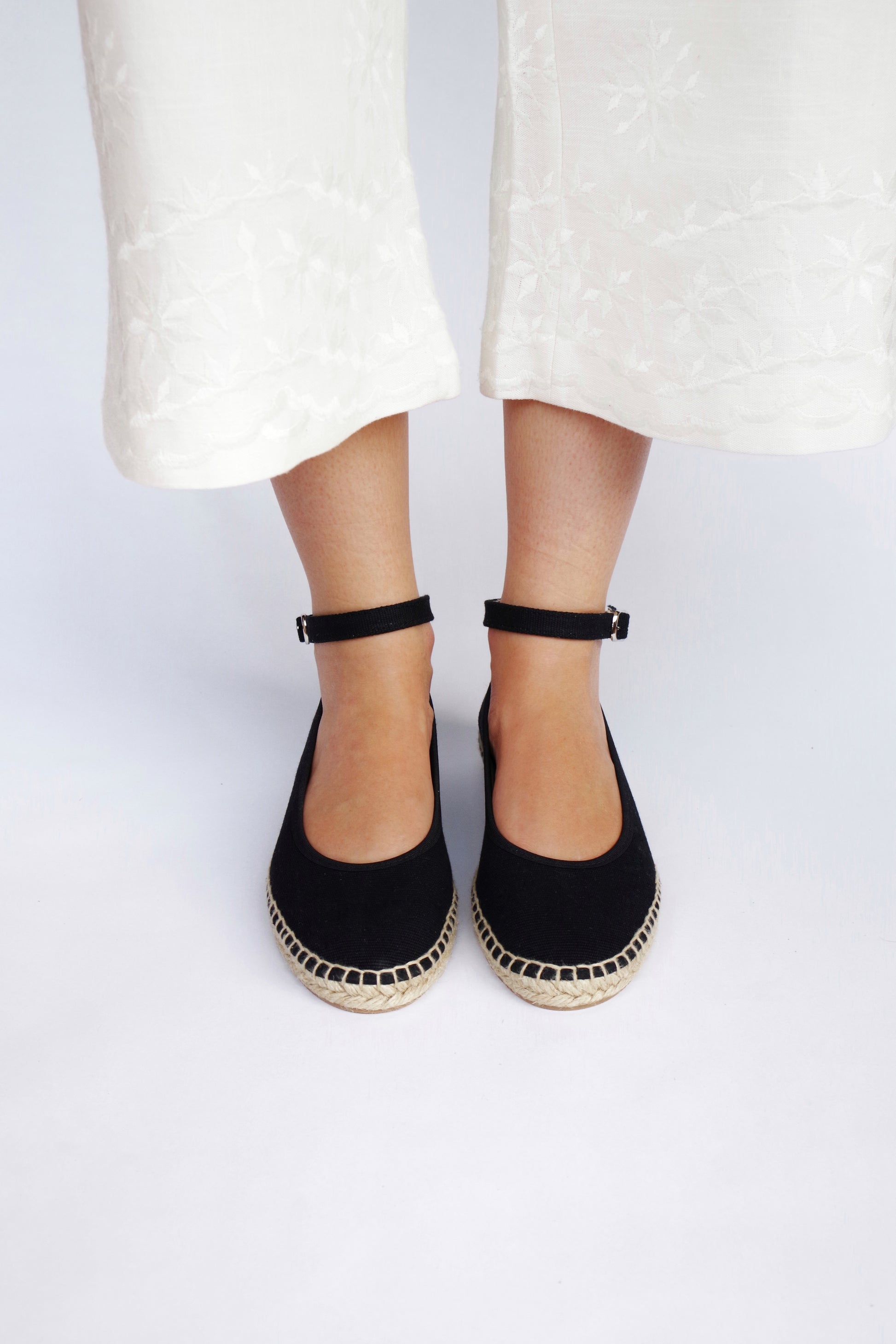Bailarina de lino con suela de esparto en color negro fabricada por artesanos españoles, cierre con hebilla al tobillo y lazos de tela negros incluidos. ¡Combínala con otros lazos!