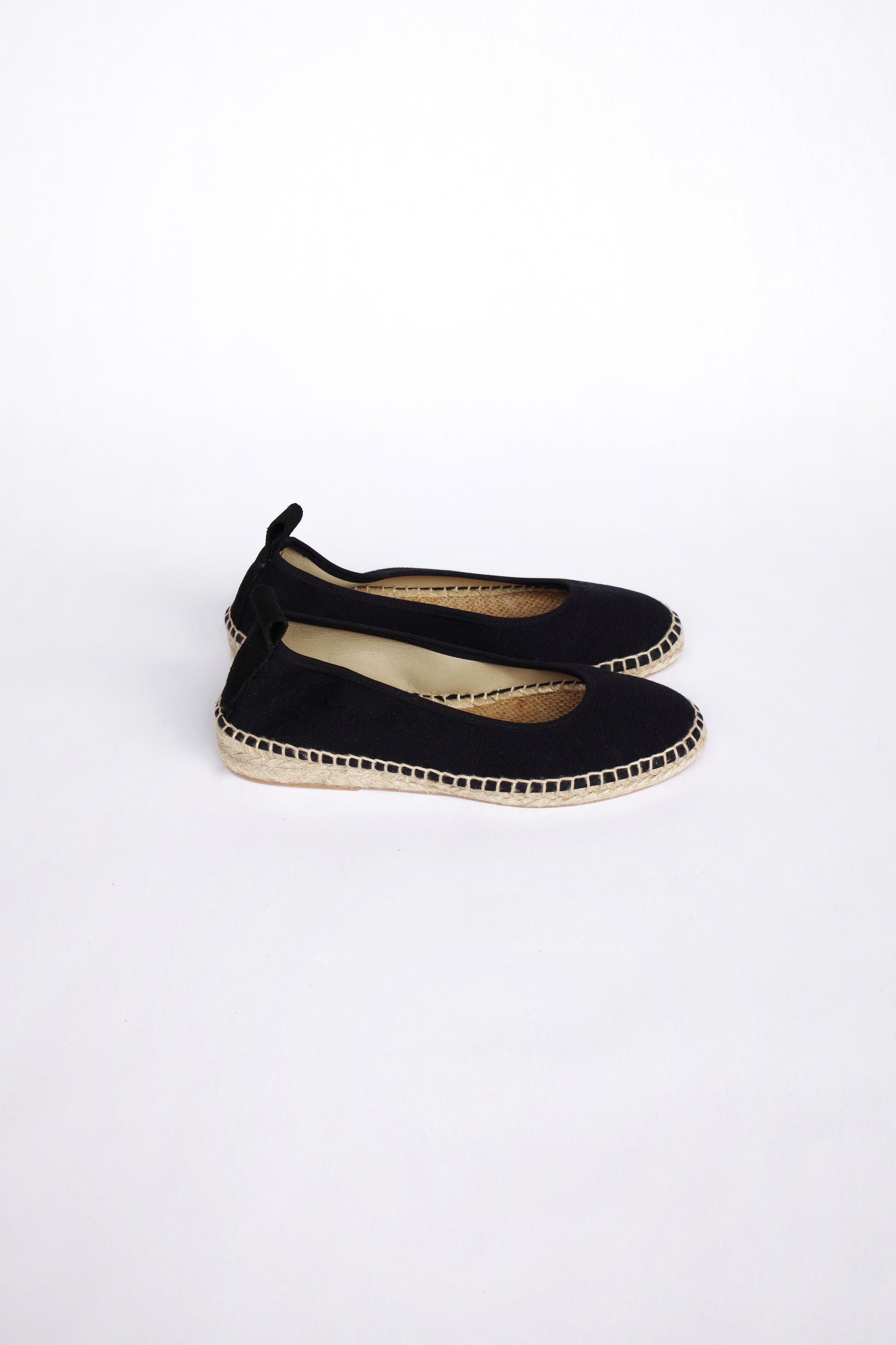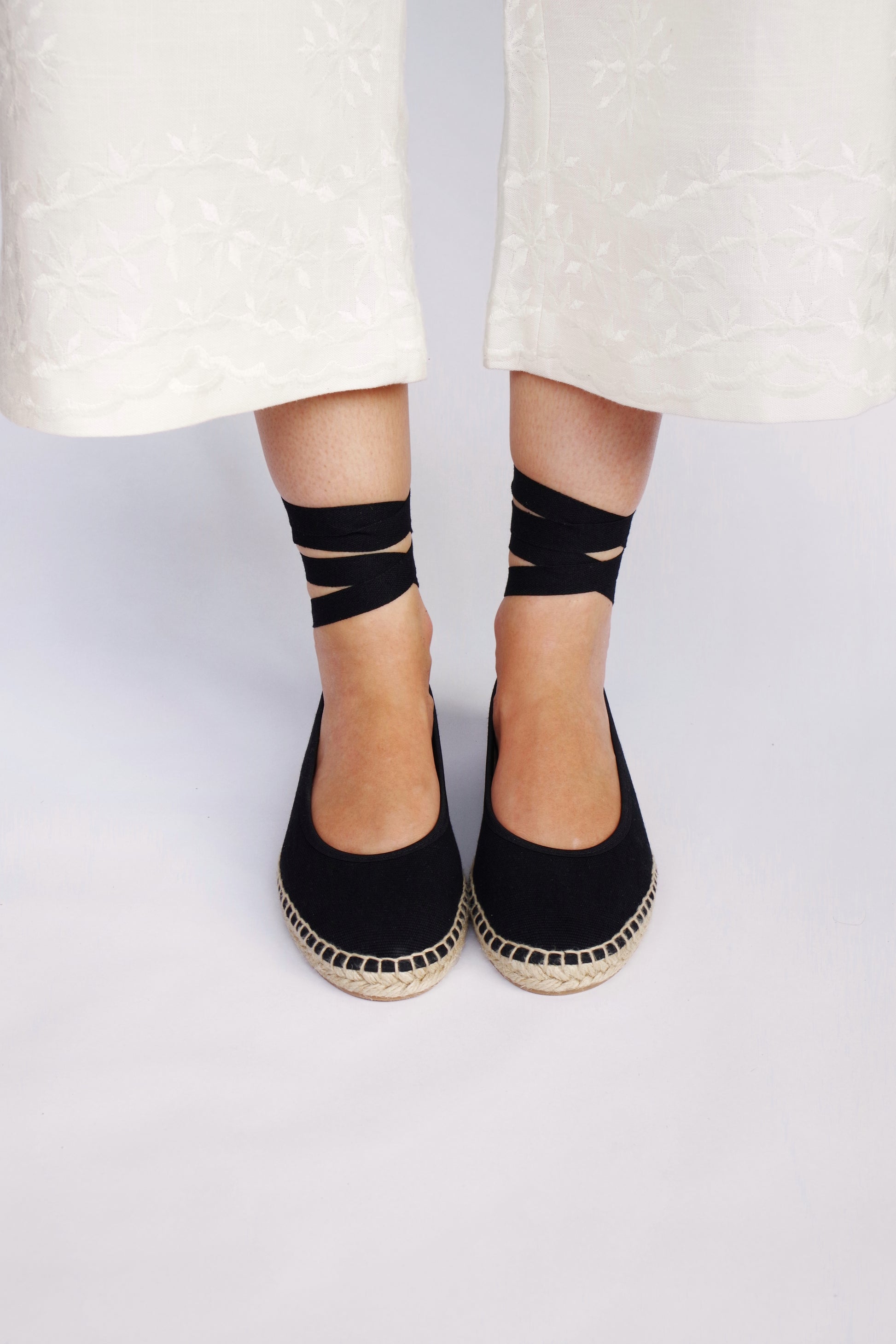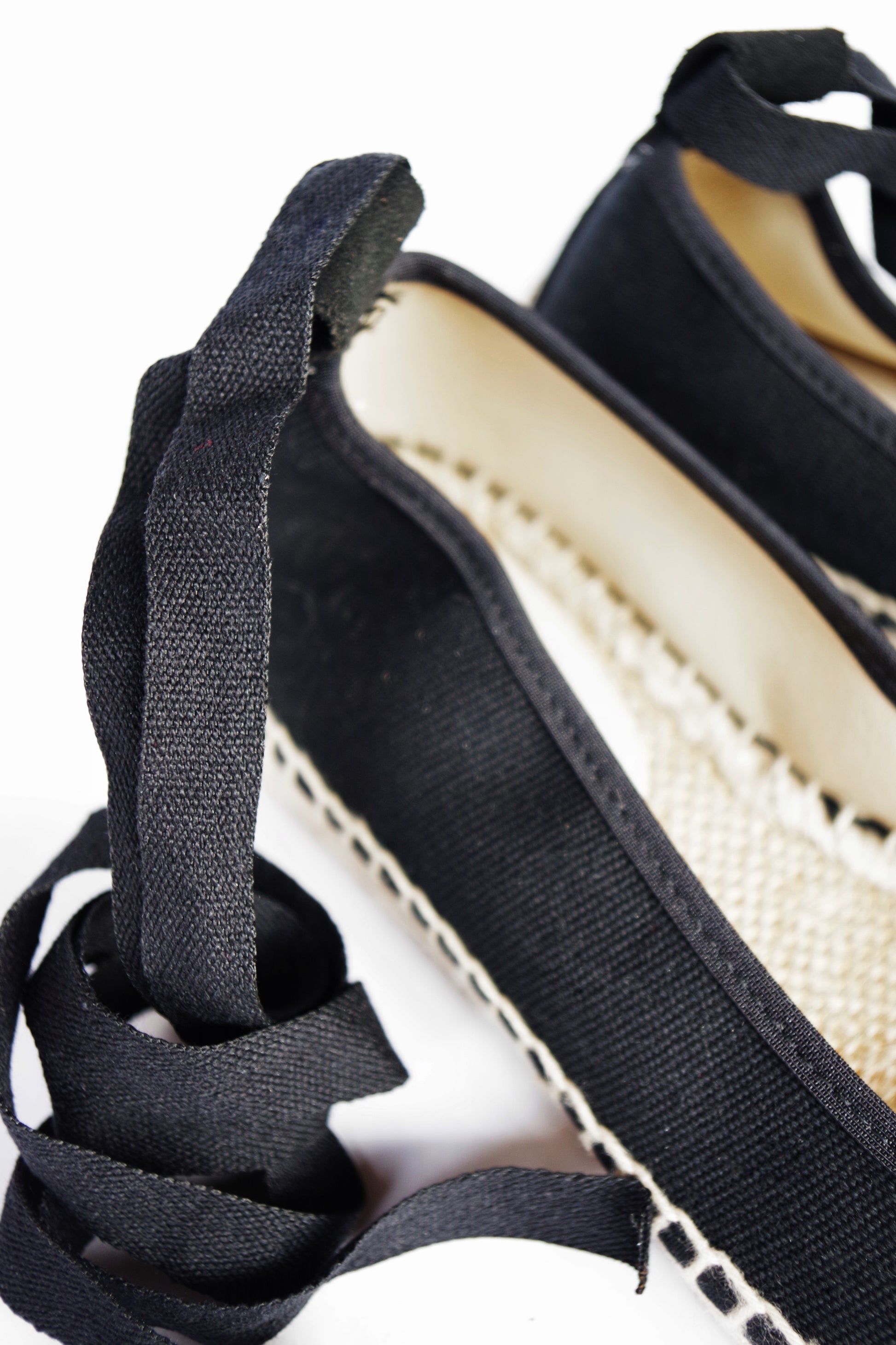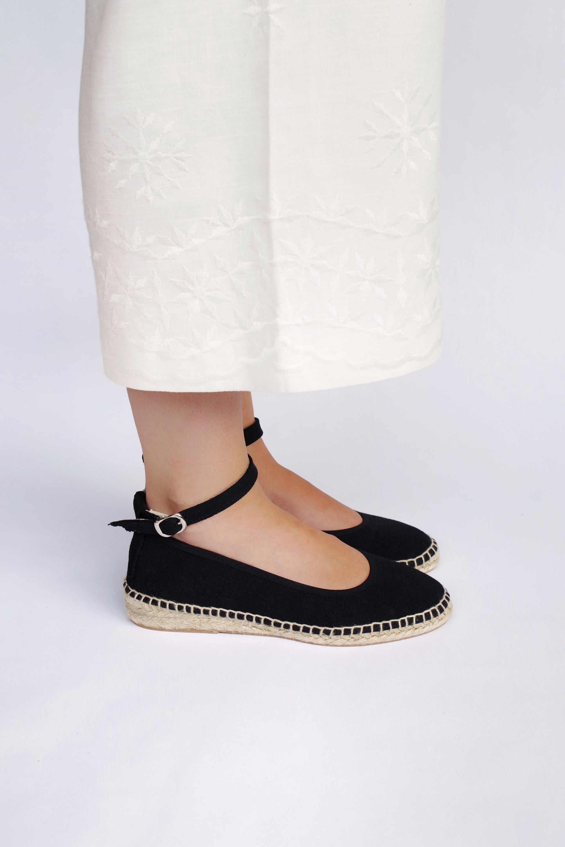 Bailarina de lino con suela de esparto en color negro fabricada por artesanos españoles, cierre con hebilla al tobillo y lazos de tela negros incluidos. ¡Combínala con otros lazos!